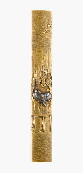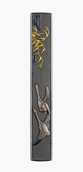 Kozuka 小柄 mit zwei fliegenden Wildgänsen und Schilf