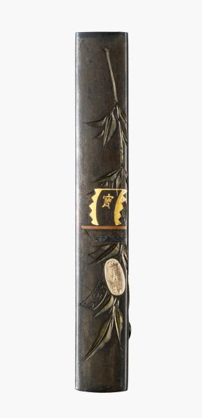Kozuka 小柄 mit Schatzschiff und Nō-Maske an Bambuszweig
